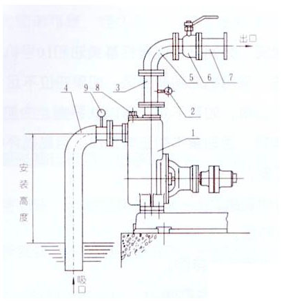 (1.泵 2.壓力表 3.出口垂管 4.吸入硬喉管 5.彎頭 6.流量控制閥 7.出口管路 8.加液螺塞 9.真空表)